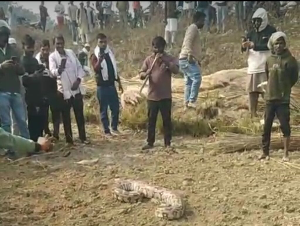 आजमगढ़ : फूलपुर कोतवाली के सरैया गांव के केवलगढ़ पुल के पास एक अजगर मिलने से हड़कंप मच गया। लगभग साढ़े 6 फीट लंबे इस अजगर को देखने के लिए लोगों की भारी भीड़ उमड़ पड़ी। सूचना मिलने के बाद सांप पकड़ने वालों को लोगो ने बुलाया। अजगर की पूँछ पकड़ करके लोग घुमा रहे थे। जिससे थक हार कर अजगर अम्बारी माहुल रोड पर एक गड्ढे में कुंडली मारकर बैठ गया। सुरक्षा की दृष्टि से अम्बारी पुलिस चौकी की पुलिस मौके पर पहुँच गयी। गुरुवार को सुबह 10 बजे ग्रामीणो ने अजगर देखा तो लोगो मे हड़कंप मच गया था। अगल बगल के लोगो की भीड़ उमड़ पड़ी । अजगर भीड़ को देख भागना चाह रहा था लेकिन कुछ लोग अजगर से खेलने लगे अंत अजगर थक हार और भीड़ से घिरा देख कर सड़क के किनारे गड्ढे में कुंडली मारकर बैठ गया। वन विभाग को सूचना दिया गया। घंटों तक वन विभाग की टीम नही पहुँच सकी थी।