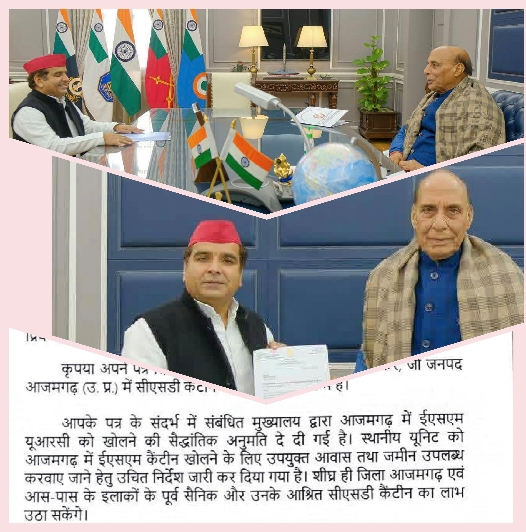 ज्ञातव्य है कि पूर्व में समाजवादी सैनिक प्रकोष्ठ के लोगो द्वारा सांसद धर्मेंद्र को ज्ञापन दिया गया था और उनकी यह बहुत पुरानी मांग थी, जिसे सांसद धर्मेंद्र यादव ने रक्षा मंत्री राजनाथ सिंह से व्यक्तिगत मुलाकात कर अपने संसदीय क्षेत्र की इस मांग को रखा था। आदेश जारी हो गया है। अब पूरे पूर्वांचल के सैनिकों को और उनके परिवारों को सीएसडी कैंटीन का लाभ आजमगढ़ में ही मिल जाएगा।