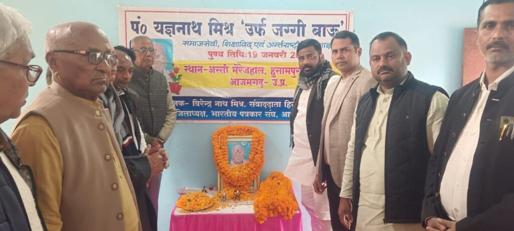 आजमगढ़ निजामाबाद क्षेत्र के बड़ागांव स्थित एक मैरेज हाल में सुबह 10 बजे से शाम 4 बजे तक शिक्षाविद, अंतरराष्ट्रीय हॉकी खिलाड़ी एवं प्रख्यात समाजसेवी पंडित यज्ञनाथ मिश्र की सातवीं पुण्यतिथि श्रद्धा एवं सम्मान के साथ मनाई गई और इस अवसर पर मुख्य अतिथि मनोज यादव पूर्व प्रत्याशी भाजपा निजामाबाद और अध्यक्षता कर रहे ब्लॉक प्रमुख मुहम्मद पुर विजय विश्वकर्मा,सहित क्षेत्र के अनेक गणमान्य लोगों ने उनके चित्र पर पुष्प अर्पित कर श्रद्धांजलि दी और पुण्यतिथि के अवसर पर समाजसेवा के क्रम में 250 जरूरतमंदों को कंबल वितरित किए गए और जिससे कार्यक्रम में उपस्थित लोगों ने उनके सेवा भाव को स्मरण किया और वही मुख्य अतिथि मनोज यादव पूर्व प्रत्याशी भाजपा निजामाबाद ने कहा कि पंडित यज्ञनाथ मिश्र बचपन से ही प्रतिभावान व्यक्तित्व के धनी थे और उन्होंने ब्रिटिश शासनकाल में अंतरराष्ट्रीय स्तर पर हॉकी प्रतियोगिताओं में भाग लेकर देश का नाम रोशन किया तथा ब्रिटिश सरकार से अनेक पुरस्कार भी प्राप्त किए और शिक्षा के क्षेत्र में भी उनका योगदान उल्लेखनीय रहा और वे आजमगढ़ के लालगंज, चंडेश्वर एवं निजामाबाद में कई विद्यालयों की फाउंडर कमेटी से जुड़े रहे और वही अध्यक्षता कर रहे ब्लॉक प्रमुख मुहम्मद पुर विजय कुमार विश्वकर्मा ने उनके व्यक्तित्व पर प्रकाश डालते हुए कहा कि पंडित यज्ञनाथ मिश्र पूरे क्षेत्र में अत्यंत लोकप्रिय थे और उनके द्वारा किए गए सामाजिक एवं शैक्षणिक कार्यों को लोग सदैव याद रखेंगे और उन्होंने बताया कि करीब तीन दशक पूर्व वे तत्कालीन निजामाबाद विधायक चंद्रबली ब्रह्मचारी के प्रतिनिधि भी रहे और क्षेत्र में लोग उन्हें स्नेहपूर्वक “जग्गी बाबू” के नाम से जानते थे कार्यक्रम का संचालन मनोज राय उर्फ रणविजय राय ने किया अवसर पर बी डी ओ रानी कि सराय राज किशोर सिंह भाजपा नेता शेर बहादुर सिंह, रानी कि सराय चिकित्सा प्रभारी डॉक्टर मनीष त्रिपाठी, , प्रवीण सिंह, संघी लाल सोनकर, देवेंद्र राय, महाप्रधान गुलाब चंद, राकेश पाठक, सर्वेश तिवारी, पंकज पाण्डेय, विजय विश्वकर्मा, मुन्ना,रंजीत चौहान, प्रेम दुबे, डॉक्टर शलमान फैजी,रवी पाठक जयहिंद यादव,लालमन यादव, ओमप्रकाश मिश्र, अजेंद्र नाथ मिश्रा धीरज तिवारी , गणेश प्रजापति दिनेश चंद्र मिश्र, , अबुजर आजमी, सहित अनेक लोग उपस्थित रहे। अंत में कार्यक्रम के संयोजक क्षेत्र पंचायत सदस्य वीरेन्द्र नाथ मिश्र ने लोगों का आभार व्यक्त किया