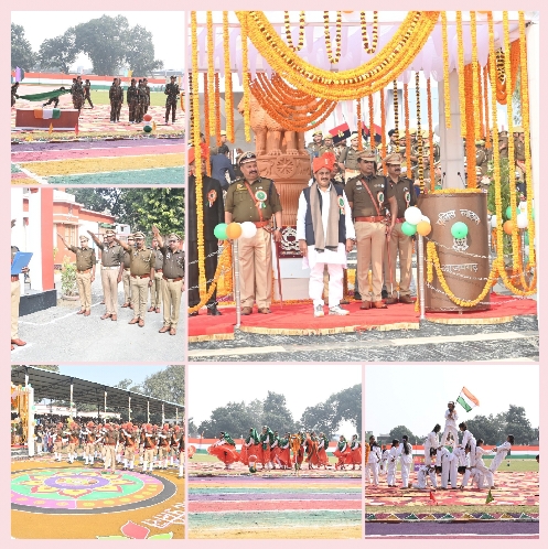 आजमगढ़: 77वें गणतंत्र दिवस के पावन अवसर पर पुलिस लाइन, आजमगढ़ के परेड ग्राउंड में दिनांक 26 जनवरी 2026 को भव्य परेड, सांस्कृतिक कार्यक्रम एवं सम्मान समारोह का आयोजन अत्यंत गरिमामय एवं अनुशासित वातावरण में संपन्न हुआ। कार्यक्रम के मुख्य अतिथि जिला कारागार मंत्री श्री दारा सिंह चौहान जी द्वारा राष्ट्रीय ध्वज फहराकर परेड का मान-प्रणाम स्वीकार करते हुए समारोह का विधिवत शुभारम्भ किया गया। इस अवसर पर मण्डलायुक्त आजमगढ़ श्री विवेक, पुलिस उपमहानिरीक्षक आजमगढ़ परिक्षेत्र सुनील कुमार सिंह, जिलाधिकारी आजमगढ़ रविन्द्र कुमार द्वितीय, वरिष्ठ पुलिस अधीक्षक आजमगढ़ डॉ0 अनिल कुमार सहित जनपद के अन्य वरिष्ठ अधिकारीगण उपस्थित रहे। अतिथि महोदय का स्वागत वरिष्ठ पुलिस अधीक्षक आजमगढ़ डॉ0 अनिल कुमार, अपर पुलिस अधीक्षक नगर मधुबन कुमार सिंह, अपर पुलिस अधीक्षक ग्रामीण चिराग जैन एवं अन्य अधिकारी/कर्मचारीगण द्वारा किया गया। तदोपरांत मुख्य अतिथि महोदय एवं वरिष्ठ पुलिस अधीक्षक आजमगढ़ द्वारा भव्य परेड का निरीक्षण किया गया। परेड में सम्मिलित 09 टोलियों का नेतृत्व प्रथम परेड कमाण्डर प्रेमसुख दरिया ( प्रशिक्षणाधीन स0पु0अ0), द्वितीय परेड कमाण्डर निरीक्षक शशीचन्द्र चौधरी तथा तृतीय परेड कमाण्डर एस0आई0ए0पी0 अभिषेक कुमार सिंह द्वारा किया गया। परेड में पु0का0, नागरिक पुलिस, सीईआर, एईआर, महिला पुलिस, पीएसी, होमगार्ड्स, सीटीएस सहित पुलिस विभाग के विभिन्न दस्तों ने सहभागिता की। इसके अतिरिक्त वायरलेस, फील्ड यूनिट, डॉग स्क्वायड, मोटर साइकिल स्क्वायड, डायल-112 स्कॉर्पियो, ईगल मोबाइल, एंटी रोमियो, सर्विलांस, क्यूआरटी/स्वाट टीम (वज्र), कैमो फ्लाइज वाहन (आधुनिक दस्ता) एवं फायर सर्विस द्वारा आधुनिक पुलिसिंग की प्रभावशाली झलक प्रस्तुत की गई। मुख्य अतिथि द्वारा सभी पुलिसकर्मियों को कर्तव्यनिष्ठा, अनुशासन एवं राष्ट्रसेवा के प्रति समर्पण हेतु प्रेरित करते हुए गणतंत्र दिवस की शुभकामनाएं दी गईं। इस अवसर पर पुलिस लाइन परेड ग्राउंड में 09 भव्य सांस्कृतिक कार्यक्रमों का आयोजन किया गया, जिसमें विभिन्न विद्यालयों एवं संस्थानों के छात्र-छात्राओं द्वारा देशभक्ति गीतों, नृत्य एवं नाट्य प्रस्तुतियों के माध्यम से राष्ट्रप्रेम एवं सांस्कृतिक चेतना को जीवंत किया गया। 1. देशभक्ति मिक्श साँग (पुलिस मार्डन स्कूल) 2. देशभक्ति सांग तिरंगा से संबंधित (राजकीय बालिका इण्टर कालेज) 3. घूमर-घूमर सांग (चिल्ड्रेन कालेज आजमगढ़) 4. झांसी की रानी की शौर्यगाथा (राहुल चिल्ड्रेन एकेडमी आजमगढ़) 5. देशभक्ति सांग (अटल आवासीय विद्यालय आजमगढ़) 6. जलवा तेरा जलवा-जलवा देशभक्ति सांग (ताइक्वांडो टीम पुलिस लाइन आजमगढ़) , 07. हरियाणवी देशभक्ति सांग(सर्वोदय पब