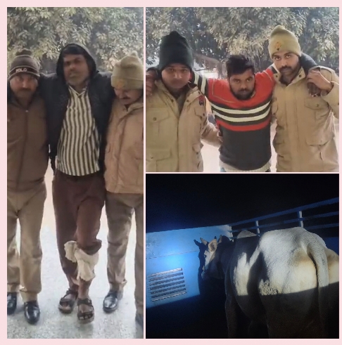 आजमगढ़: 3 फरवरी की रात्रि में थाना सरायमीर पुलिस द्वारा व्यक्ति, वाहन चेकिंग एवं रात्रि गश्त की जा रही थी। सूचना प्राप्त हुई कि थाना क्षेत्र के ग्राम डेमरी मकदुमपुर में पूर्व में हुई गोकशी की घटना में संलिप्त शातिर गोतस्कर पुनः एक पिकअप वाहन में गोवंश लादकर गोकशी की नीयत से दीदारगंज–सरायमीर मार्ग होते हुए उक्त ग्राम की ओर जा रहे हैं। सूचना पर विश्वास कर प्रभारी निरीक्षक थाना सरायमीर पुलिस बल द्वारा तत्काल घेराबंदी की गई। सिकरौर सहबरी के आगे संदिग्ध पिकअप वाहन को रोकने का प्रयास किया गया, किंतु वाहन सवार बदमाशों ने पुलिस को देखकर अवरोधक तोड़ते हुए तेज गति से वाहन भगा दिया। पुलिस द्वारा बदमाशों की घेराबंदी की गई, जिसमें बदमाशों द्वारा पिकअप वाहन छोड़कर पैदल भागते हुए पुलिस पार्टी पर फायरिंग की गई। पुलिस द्वारा आत्मसमर्पण की चेतावनी दी गई, किंतु बदमाशों द्वारा पुनः फायरिंग का प्रयास किया गया। पुलिस द्वारा की गई जवाबी कार्रवाई में 02 बदमाशों पैर में गोली लगने से घायल हो गए, जबकि दो अन्य बदमाश अंधेरे एवं भौगोलिक स्थिति का लाभ उठाकर फरार हो गए।