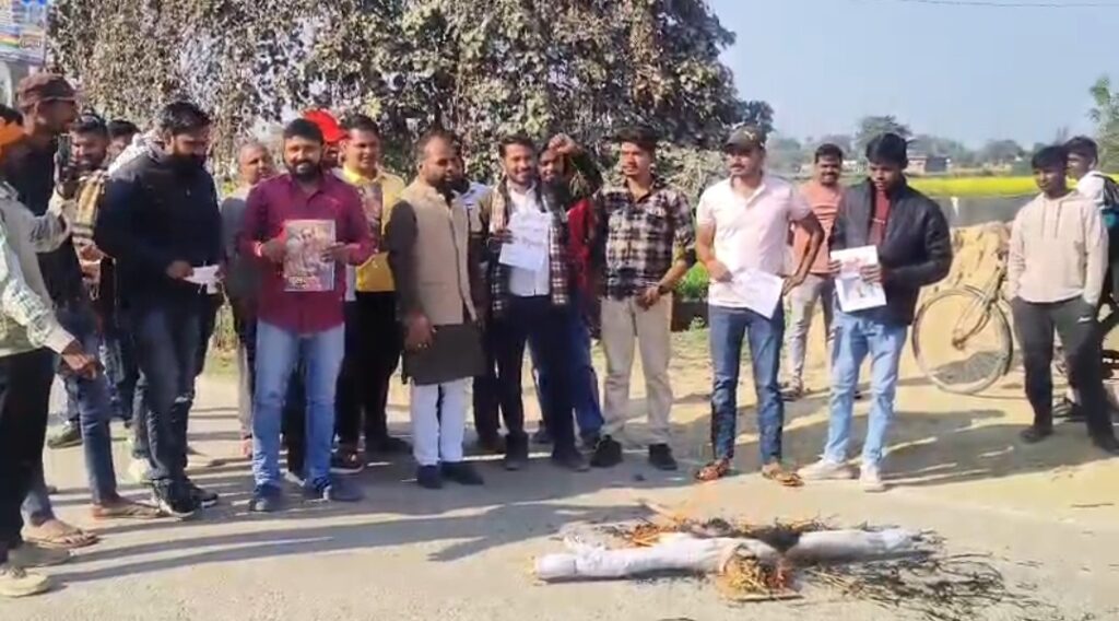 आज़मगढ़ – नेटफ्लिक्स की आगामी वेब सीरीज ‘घूसखोर पंडित’ को लेकर क्षेत्र में विरोध तेज हो गया है। सोमवार को स्थानीय नंदना बाजार में युवा भाजपा नेता एवं पूर्व ब्लॉक प्रमुख प्रत्याशी हर्षित सिंह के नेतृत्व में लोगों ने सड़क किनारे जोरदार विरोध प्रदर्शन किया और वेब सीरीज के निर्माता का पुतला फूंका।