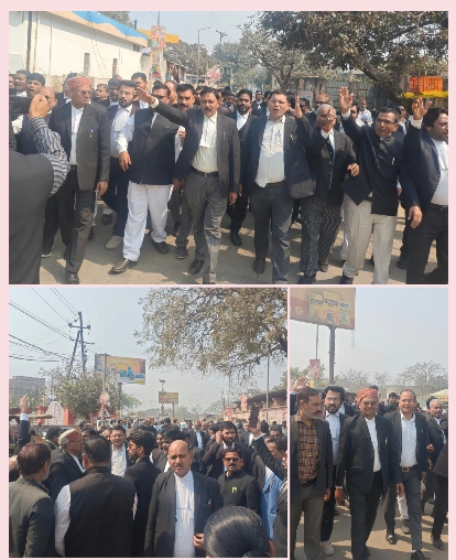 आजमगढ़: एडवोकेट एक्ट में संशोधन के प्रस्ताव से नाराज दीवानी न्यायालय के अधिवक्ता मंगलवार को पूरे दिन न्यायिक कार्य से विरत रहे।आक्रोशित अधिवक्ताओं ने सड़क पर उतर कर नारेबाजी भी किया।इस संबंध में दीवानी न्यायालय अभिभाषक संघ की साधारण सभा की आपात बैठक हुई ।बैठक की अध्यक्षता संघ के अध्यक्ष प्रभाकर सिंह ने तथा संचालन संघ के मंत्री अनुराग कुमार दीक्षित ने किया।बैठक में एडवोकेट एक्ट में संशोधन किए जाने का प्रस्ताव लाए जाने पर नाराजगी जताई गई। बैठक सर्वसम्मति से पूरे दिन या एकादशी व्रत रहने का निर्णय लिया गया। तत्पश्चात सभी अधिवक्ता अध्यक्ष प्रभाकर सिंह नेतृत्व में गिरजाघर चौराहे से लेकर सिविल लाइंस चौराहे तक नारेबाजी करते हुए जुलूस निकाला।इस जुलूस में मंत्री अनुराग कुमार दीक्षित,पूर्व मंत्री अनिल सिंह, पूर्व उपाध्यक्ष अशोक सिंह, अरूणेंद्र कुमार सिंह, बलवंत सिंह बृजेश कुमार सिंह, हरिकेश यादव, रविंद्र कुमार यादव, अशोक कुमार पांडे, सुधांशु राय, पंकज सिंह अजय यादव , संत विजय निषाद आदि बहुत से अधिवक्ता शामिल रहे