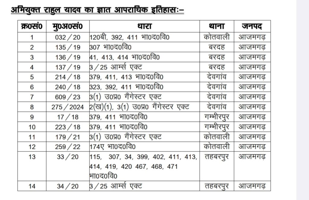 उसने अपने गिरोह के साथ मिलकर आजमगढ़ के विभिन्न थाना क्षेत्रों—बरदह, कोतवाली और देवगांव—में कई वारदातों को अंजाम दिया।