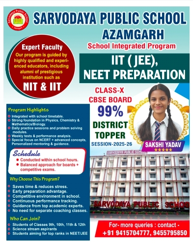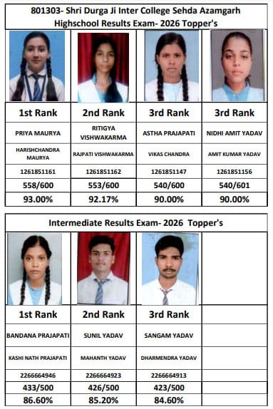 आजमगढ़। यूपी बोर्ड परीक्षा 2026 में श्री दुर्गा जी इंटर कॉलेज, सेहदा-आजमगढ़ के छात्रों ने उत्कृष्ट प्रदर्शन करते हुए विद्यालय का नाम रोशन किया है। हाईस्कूल और इंटरमीडिएट दोनों परीक्षाओं में विद्यालय का परीक्षाफल शत-प्रतिशत रहा, जिससे शिक्षकों और अभिभावकों में खुशी का माहौल है।