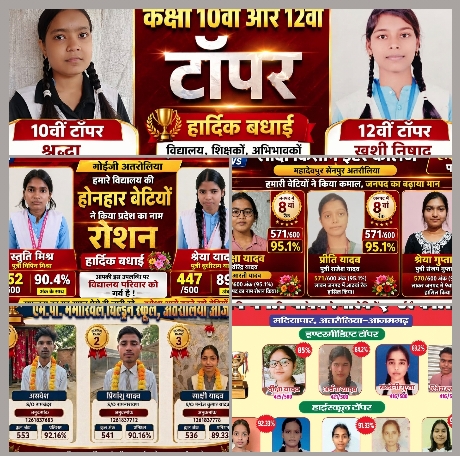 आजमगढ़: (आशीष कुमार निषाद)अतरौलिया क्षेत्र में इस वर्ष हाईस्कूल और इंटरमीडिएट परीक्षा परिणाम ने बेटियों की सफलता की नई इबारत लिख दी है। टॉप-10 सूची में क्षेत्र की कई छात्राओं ने जगह बनाकर अपनी प्रतिभा का लोहा मनवाया, वहीं विद्यालय स्तर पर भी छात्राओं ने शानदार प्रदर्शन कर क्षेत्र का नाम रोशन किया। सफल विद्यार्थियों के सम्मान में विभिन्न स्कूलों में समारोह आयोजित कर उनका उत्साहवर्धन किया गया।