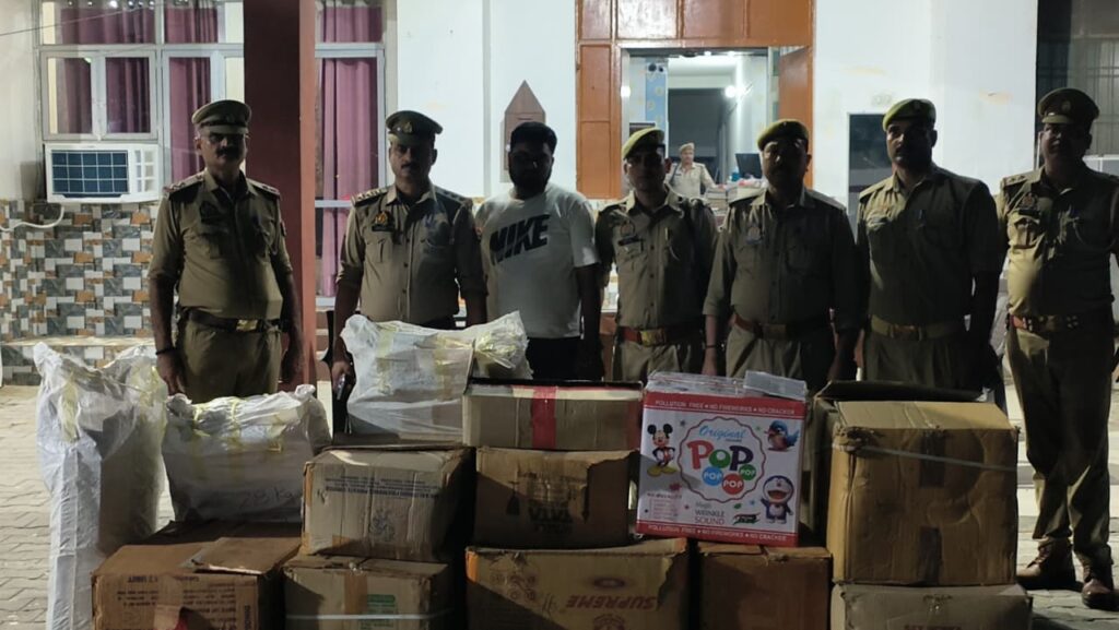 आजमगढ़ में अवैध पटाखा निर्माण और अवैध पटाखा भंडारण के खिलाफ पुलिस का अभियान जारी है। इसी क्रम में शुक्रवार की शाम को आजमगढ़ शहर के मुख्य चौक के समीप फ़राश टोला की गली में पुलिस ने छापेमारी की। पटाखे के गोदाम की सूचना के बाद पुलिस की छापेमारी हुई। जिससे हड़कंप मच गया। पुलिस ने तंग गली के अंदर बने गोदाम से दो कुंतल 90 किलो आतिशबाजियों को बरामद किया। यह आतिशबाजी विभिन्न गत्तों में रखी गई थी। जिसमें बम से लेकर रॉकेट, चरखी, अनार चटाई समेत तमाम पटाखे रखे थे। प्रदेश में कई स्थानों पर पिछले दिनों हुई घटना के बाद शासन की तरफ से भी लगातार अभियान चलाने का निर्देश है। जिसके क्रम में पुलिस लगातार सूचना के आधार पर कार्रवाई कर रही है। एक दिन पूर्व ही सरायमीर में भी कार्रवाई की गई थी। शुक्रवार की कार्रवाई को लेकर एसपी सिटी मधुबन कुमार सिंह ने बताया कि दुकानदार के विरुद्ध नियमानुसार कार्रवाई की जा रही है।