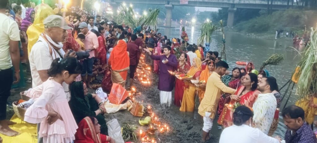 आज़मगढ़ : शहर से लेकर ग्रामीण अंचल तक अस्ताचलगामी भगवान भास्कर को अर्घ्य देने के लिए भारी संख्या में महिलाओं की भीड़ उमड़ पड़ी। नदी के घाटो से लेकर सरोवर और अन्य जलाशयों पर हुजूम उमड़ पड़ा। शहर में कई लोगों ने घरों की छत पर टब में अर्घ्य दिया। हालांकि घाटों पर एक अलग ही नजारा था। सोमवार को पूरे दिन भगवान भास्कर बादलों की ओट में ही छिपे रहे। शाम को भी यही स्थिति रही। लोगों ने सूर्यास्त का समय देखकर आगे दिया। सूर्यास्त के समय महिलाएं व पुरुष विभिन्न पकवान, फल-फूल, पान सुपारी, रोरी, अक्षत, दूध आदि पूजन सामग्री बांस की बनी सुपोलियों में रखकर अस्त हो रहे सूर्य को अर्ध्य दिया। देर शाम पुनः महिलाएं सुपोली में जलता हुआ घी का दिया लेकर घर आयीं जिसे पूरी रात जलाई। महिलाएं सुहाग जोडे में सजकर मंगलगीत गाती गाजे बाजे के साथ नंगे पांव घाटों एवं जलाशयों पर पहुंचकर जल के भीतर खडी होकर उगते हुए सूर्य का इन्तजार करती हुई उगते हुए भगवान भाष्कर को अर्घ्य दिया। ग्रामीण क्षेत्र में अस्ताचल सूर्य को छठ व्रती महिलाओं ने अर्घ्य दिया कोई पुत्र कामना को लेकर तो कोई समृद्धि और सुख को लेकर रखी थी व्रत, छठ के महापर्व पर सभी नगर पंचायत सहित पूरे क्षेत्र में जलाशयों नदियों के घाटों पर बड़ी ही धूमधाम और उल्लास से मनाया गया। पोखरा पर सैकड़ों की संख्या में महिलाओं ने अस्ताचल में जाते सूर्य को सर्व मंगल की कामना लेकर अर्घ्य दिया। कमर भर पानी में खड़ी होकर सूर्य ध्याम कर रही थी। शाम होते होते जगमग रोशनी में पूरा घाट सज गया। वहीं समाजसेवी संस्थाओं द्वारा घाट पर चाय आदि की व्यवस्था भी किया गया था।